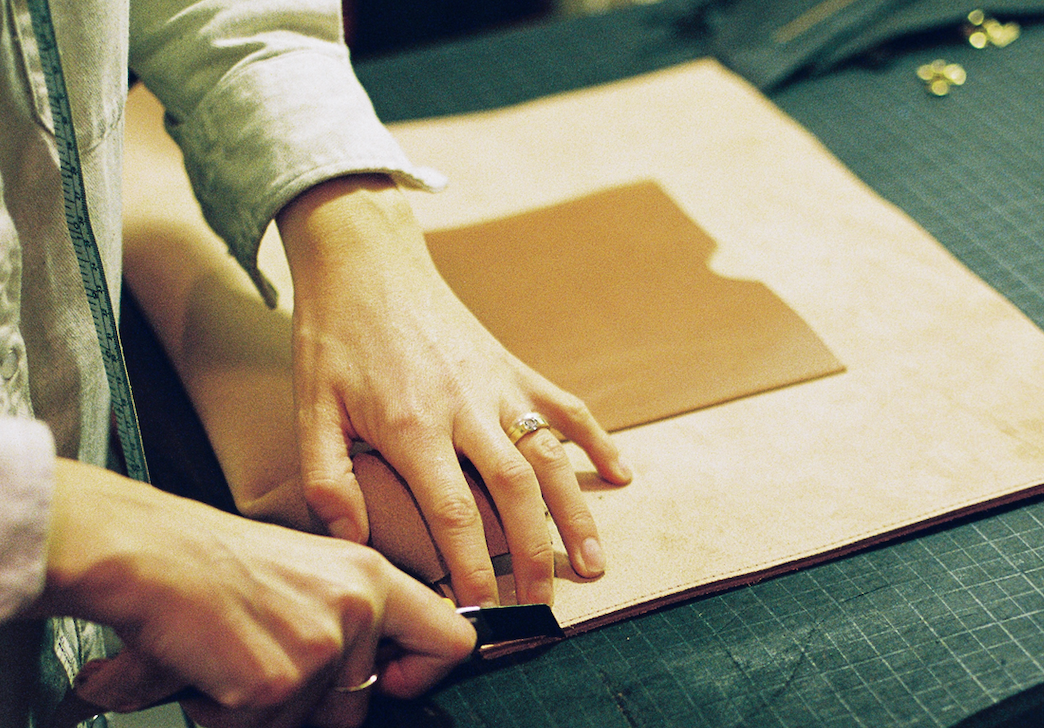Person wearing a white shirt and black pants holding a brown leather bag against a white background